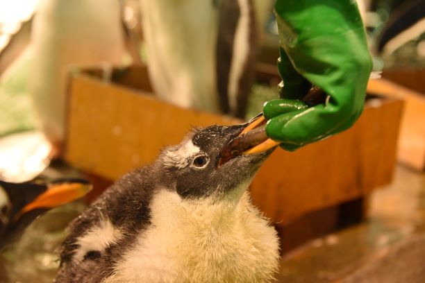 ヒトの手からおさかなごっくん練習を始めたとのことで